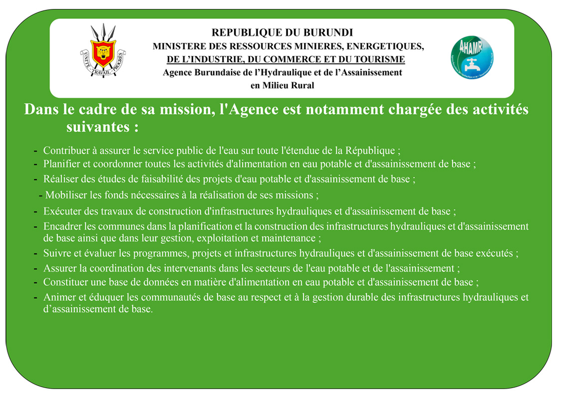 L'Agence a pour mission l'élaboration des politiques, des programmes et des projets d'eau potable et d'assainissement de base dans le milieu rural. Elle exécute ou fait exécuter les études et/ou travaux nécessaires relevant de sa mission.